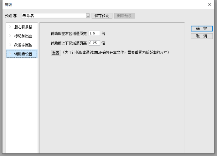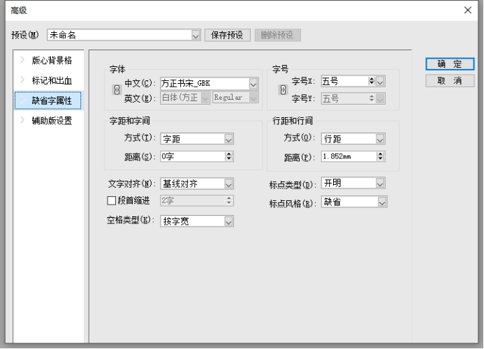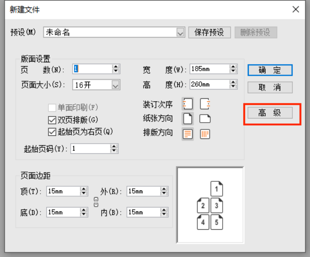 在新建文件对话框中,我们可以对排版文件进行基础设置,针对书本设计的要求,可以对书本的版面大小和天头地脚的数值进行设置。