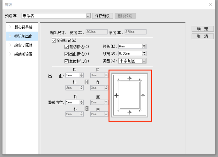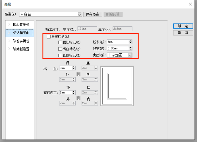 【标记和出血】中,可设置裁切标记、出血标记、套位标记以及它们的详细数值