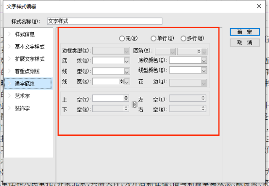 通字底纹选项 通字底纹中可以设置文字的通字底纹的类型、颜色、线性、线宽以及底纹分布位置进行设置。