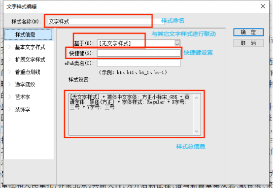 文字样式编辑窗口 样式信息的选项中可以对文字的样式总信息进行预览,也可以对该样式的快捷键进行设置和更改。值得注意的是,在设置文字样式时,要根据个人偏好和理解对样式命名进行明确的设置,方便后期使用和更改。